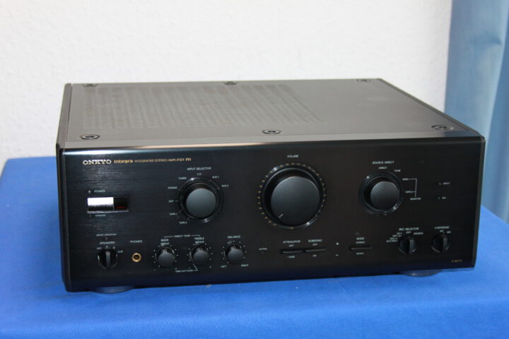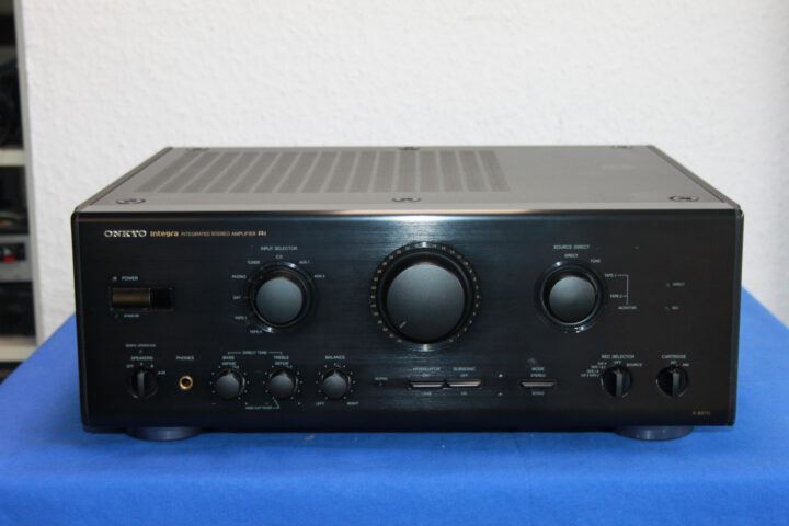 Seinerzeit einer der größten Vollverstärker von Onkyo, der Verstärker ist jedoch überholungsbedürftig, Eingangswahlschalter springt (Serienproblem) Netzschalter macht Probleme – Fundgrubengerät an Bastler!